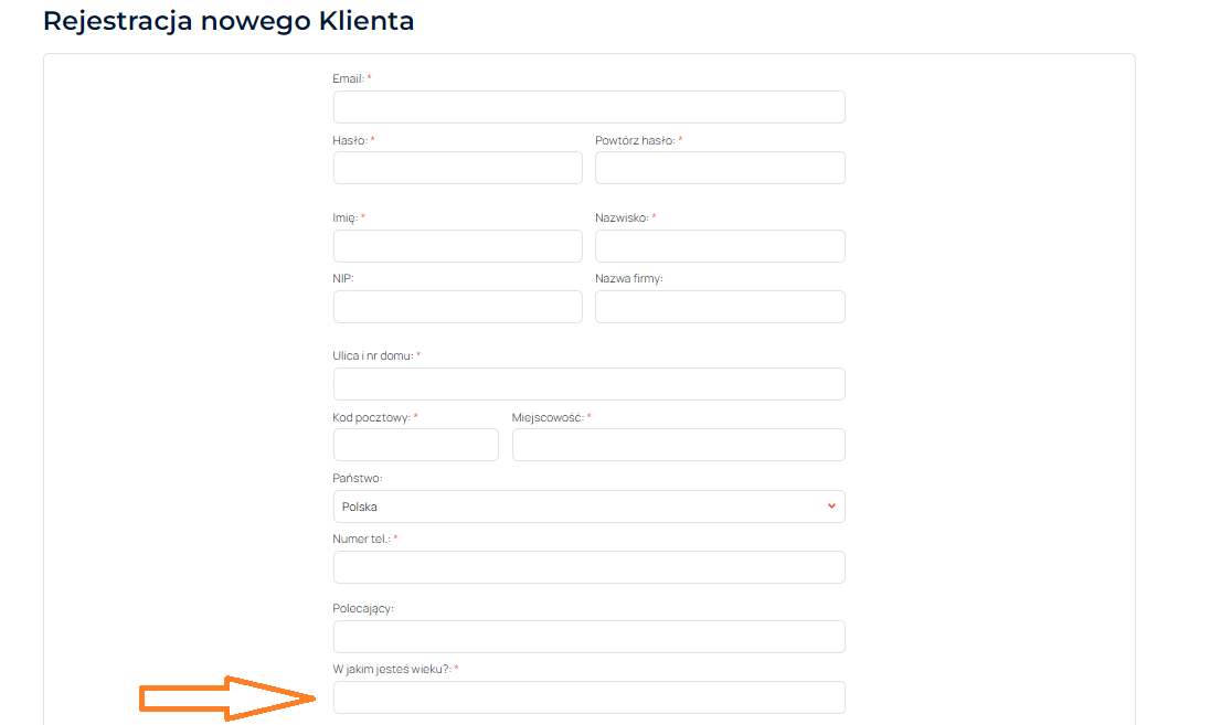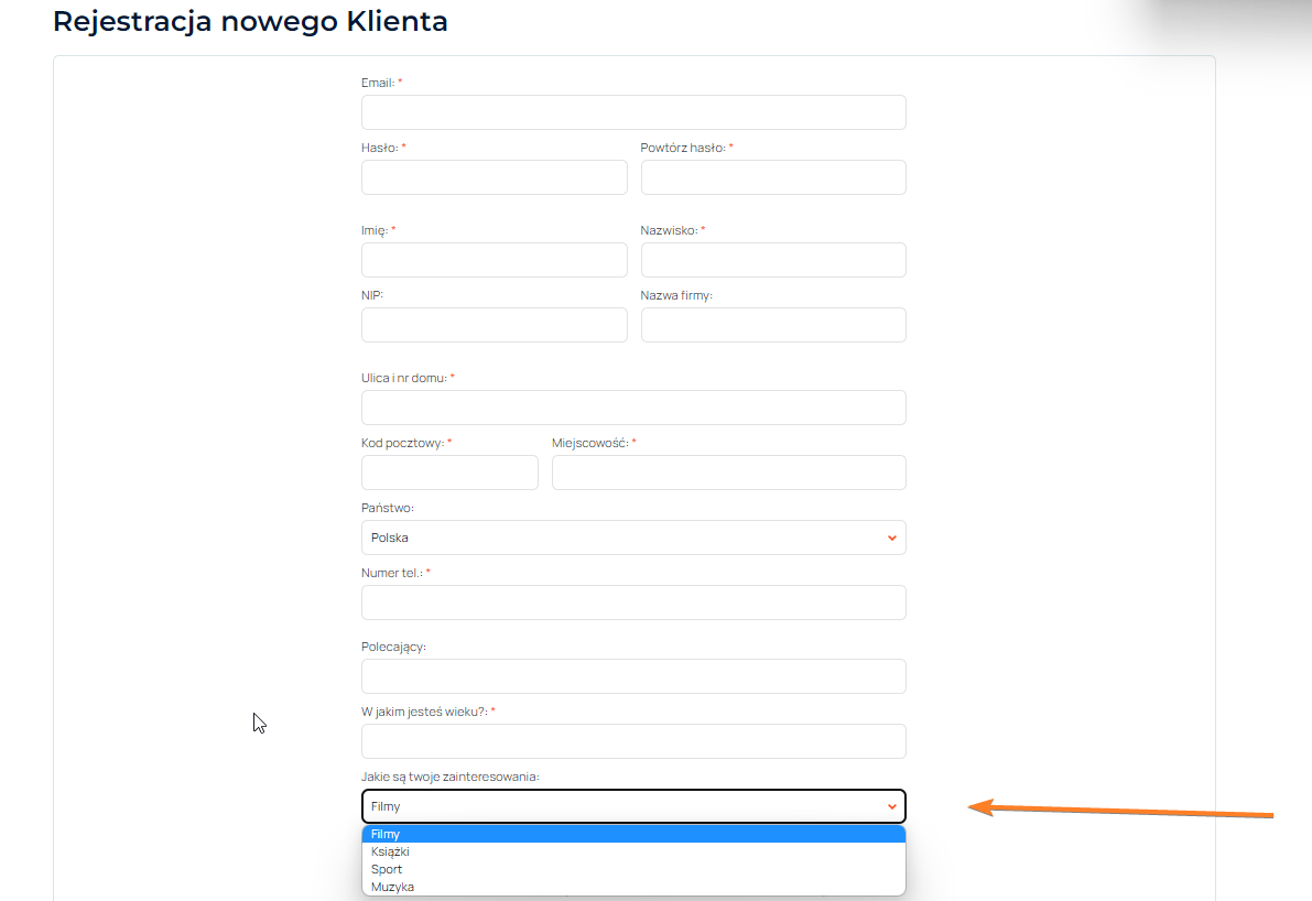 Do formularza rejestracji dodamy pole input z zapytaniem o wiek klienta oraz pole select z zapytaniem, jakie są zainteresowania klienta.