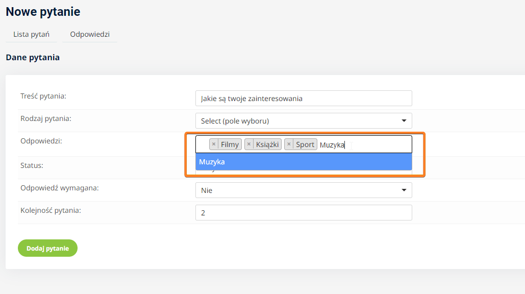 W tym przypadku schemat dodania nowego zapytania jest taki sam jak w punkcie pierwszym, natomiast zmienimy treść pytania oraz rodzaj pola. Przy wyborze rodzaju pola select, w polu odpowiedzi należy wpisać te, które mają być dostępne do wyboru przez klienta w formularzu rejestracji i po wpisaniu nacisnąć klawisz enter lub kliknąć we wpisaną odpowiedź.
