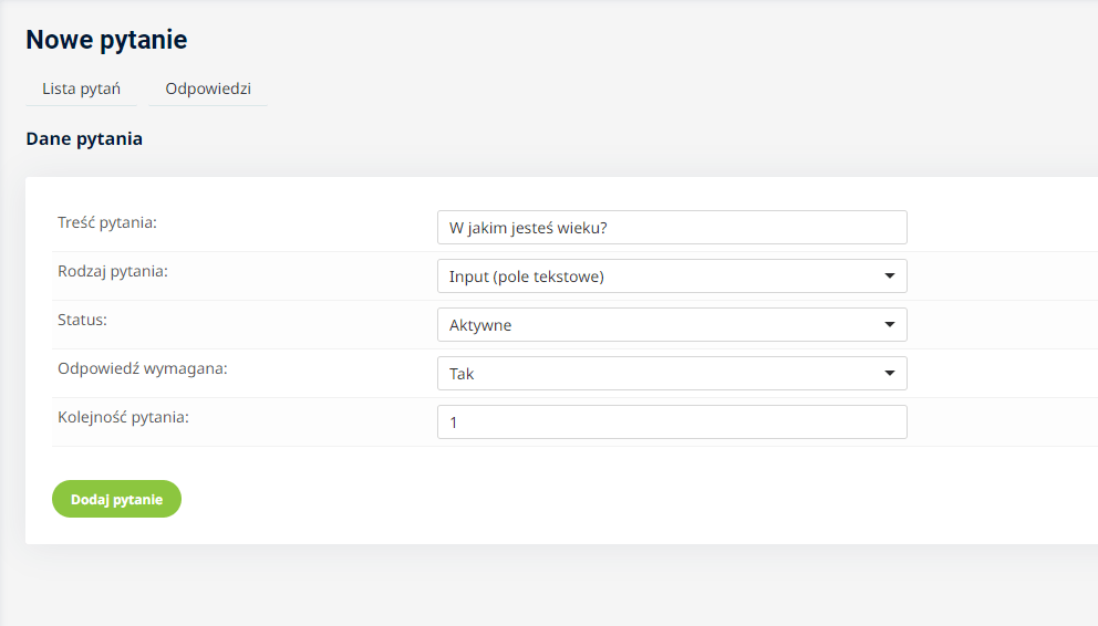 Po kliknięciu we wcześniej wymieniony przycisk przejdziemy do konfiguracji nowego pytania w formularzu rejestracyjnym, gdzie ustalimy treść pytania, rodzaj pola, status, kolejność w formularzu oraz to czy odpowiedź na to pytanie będzie wymagana.