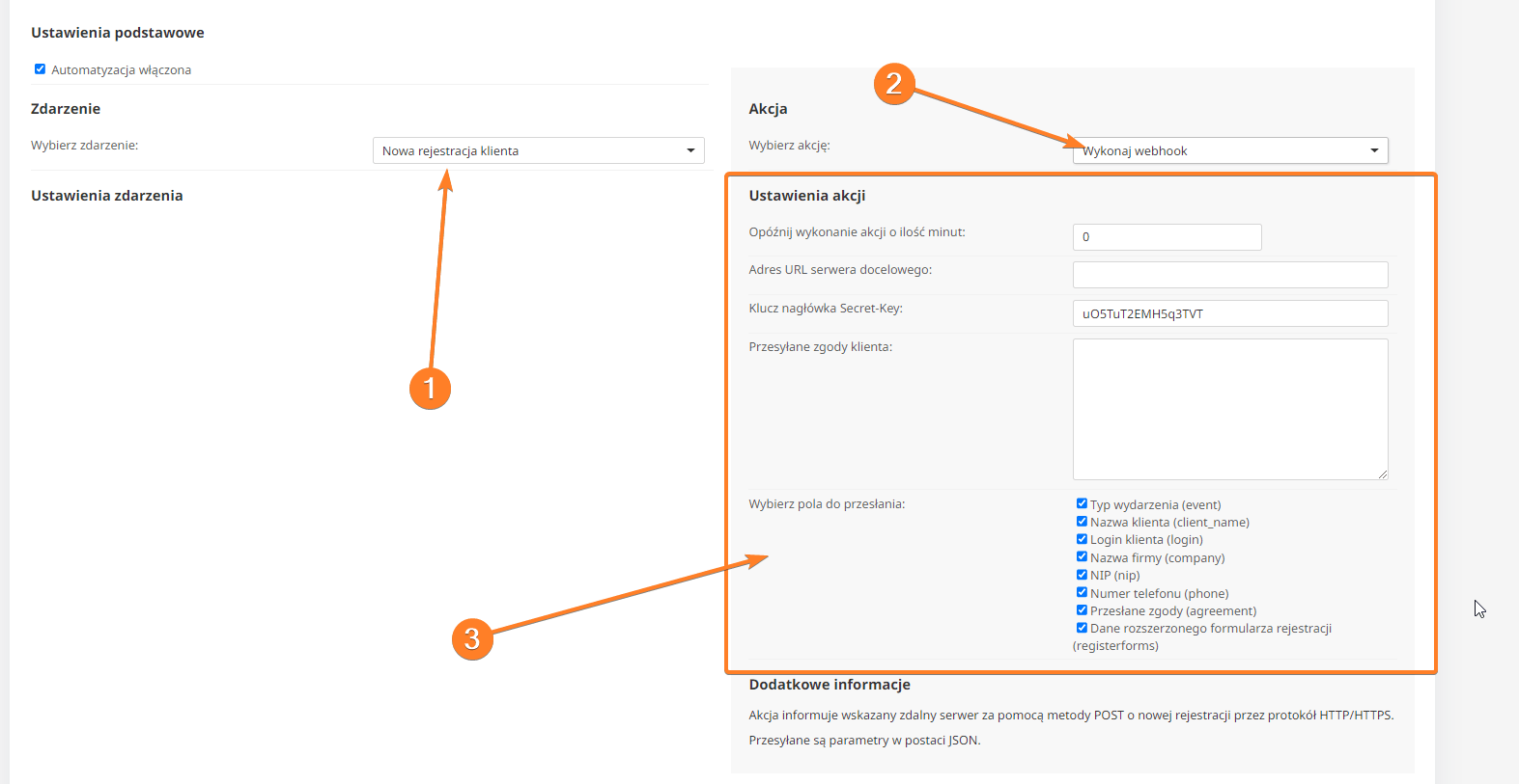 Ta opcja umożliwia nam przesłanie danych dotyczących nowo zarejestrowanego klienta na serwer wewnętrzny. W pierwszej kolejności należy wybrać rodzaj zdarzenia, następnie rodzaj akcji, która ma zostać wywołana, a na koniec należy wypełnić zaznaczone pola, aby dane zostały poprawnie przesłane.