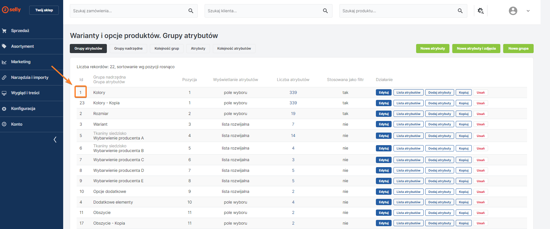 W module Asortyment/Warianty i opcje produktów wybieramy ID grupy, której opcję będziemy chcieli usunąć.