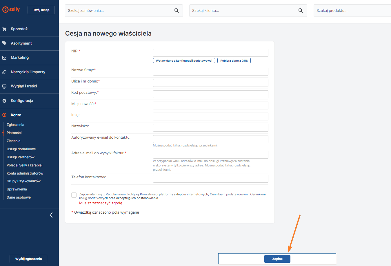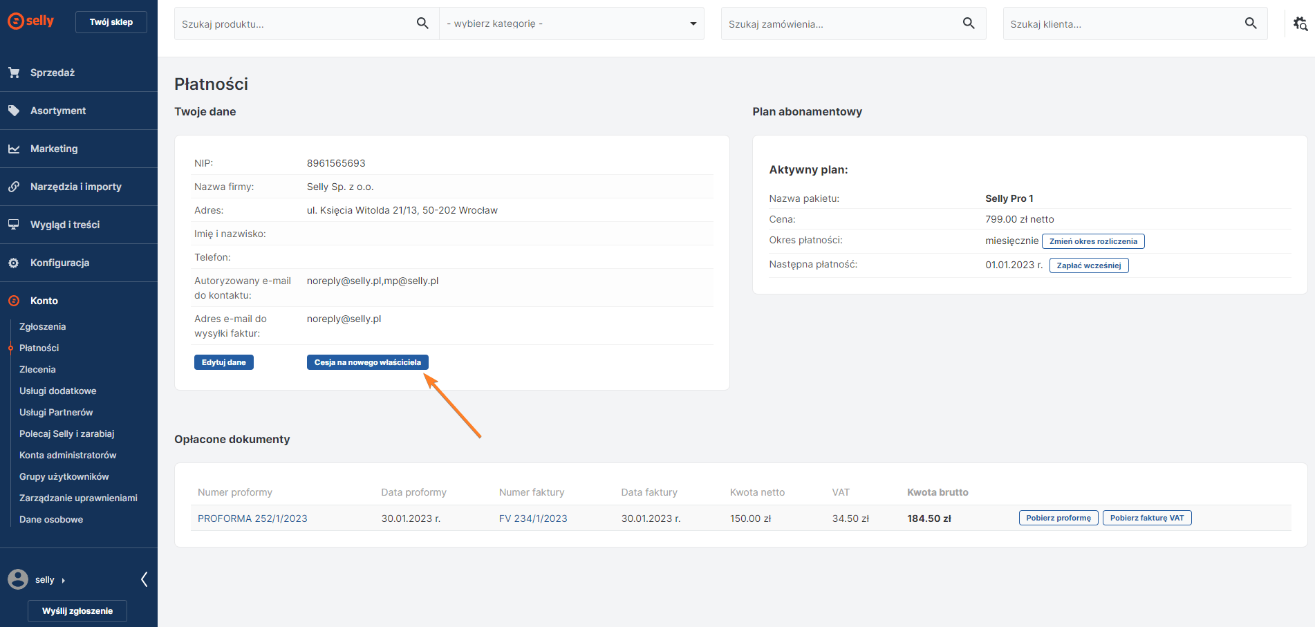 W panelu administracyjnym w module Konto/Płatności pojawił się przycisk „Cesja na nowego właściciela” co znacznie ułatwi proces przekazania sklepu nowemu właścicielowi.