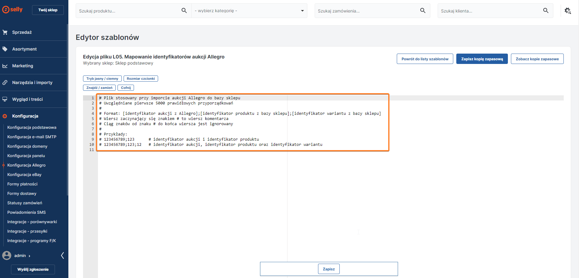 Mapowanie aukcji możemy wykonać w module Wygląd i treści/Edytor szablonów w szablonie L05. Mapowanie identyfikatorów aukcji Allegro.