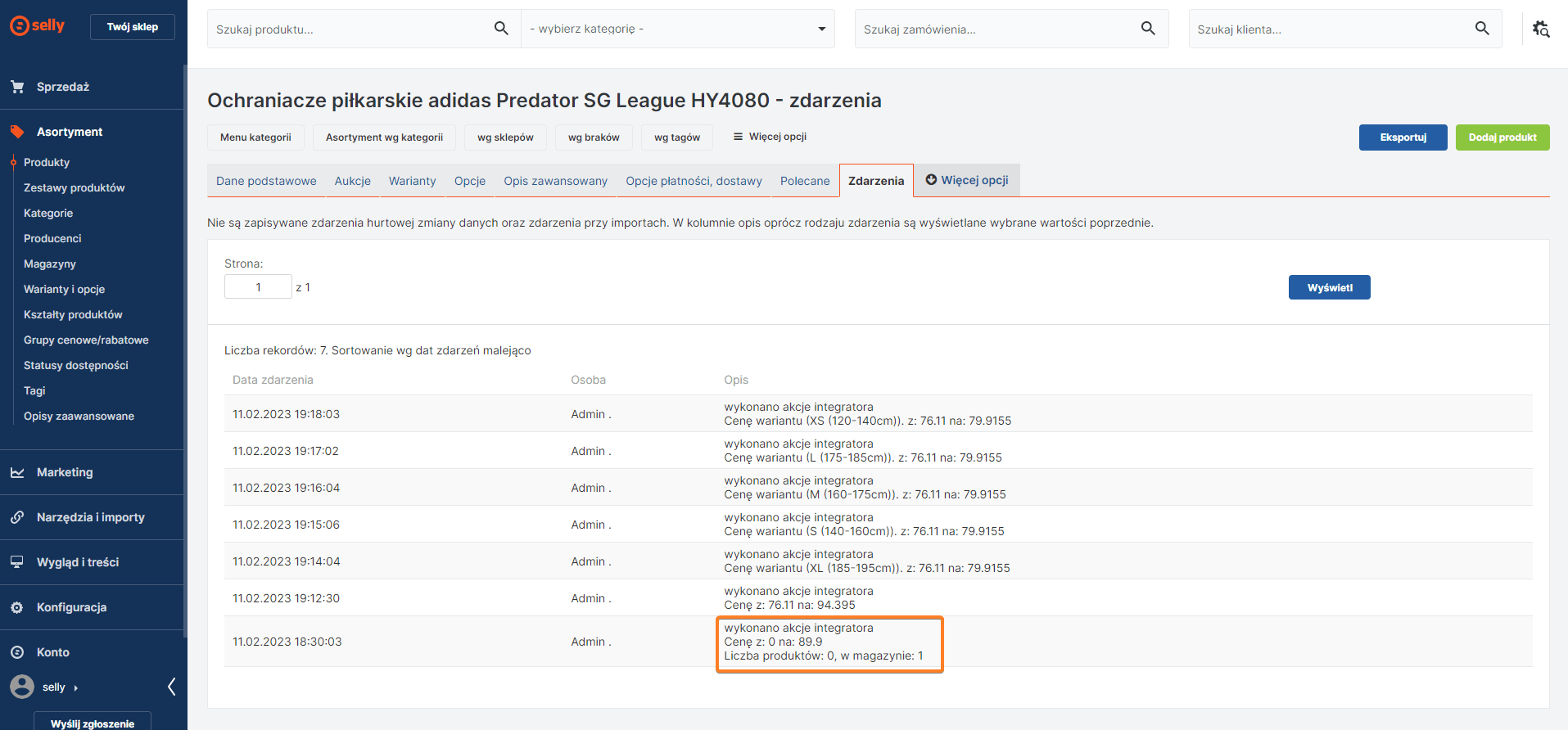 Zdarzenia w produkcie z importów wykonywanych przez Integrator XML/CSV