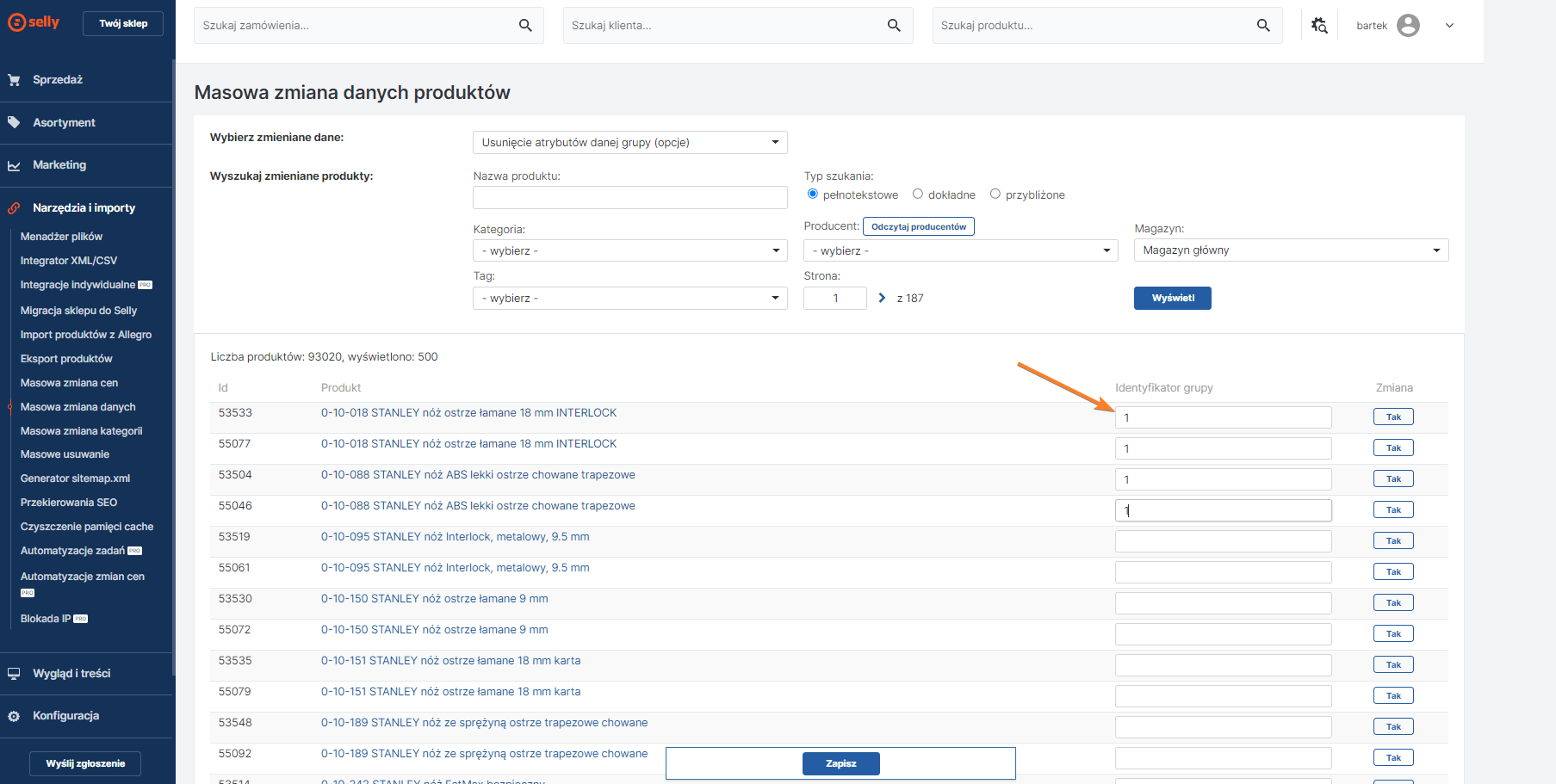 Następnie przechodzimy do modułu Narzędzia/Masowa zmiana danych i wybieramy z listy „Usunięcie atrybutów danej grupy (opcje)” i w polu „Identyfikator grupy” wpisujemy ID grupy atrybutów przy wybranym produkcie, następnie klikamy przycisk „Zapisz” i opcje wybranej grupy atrybutów zostają usunięte z produktów.