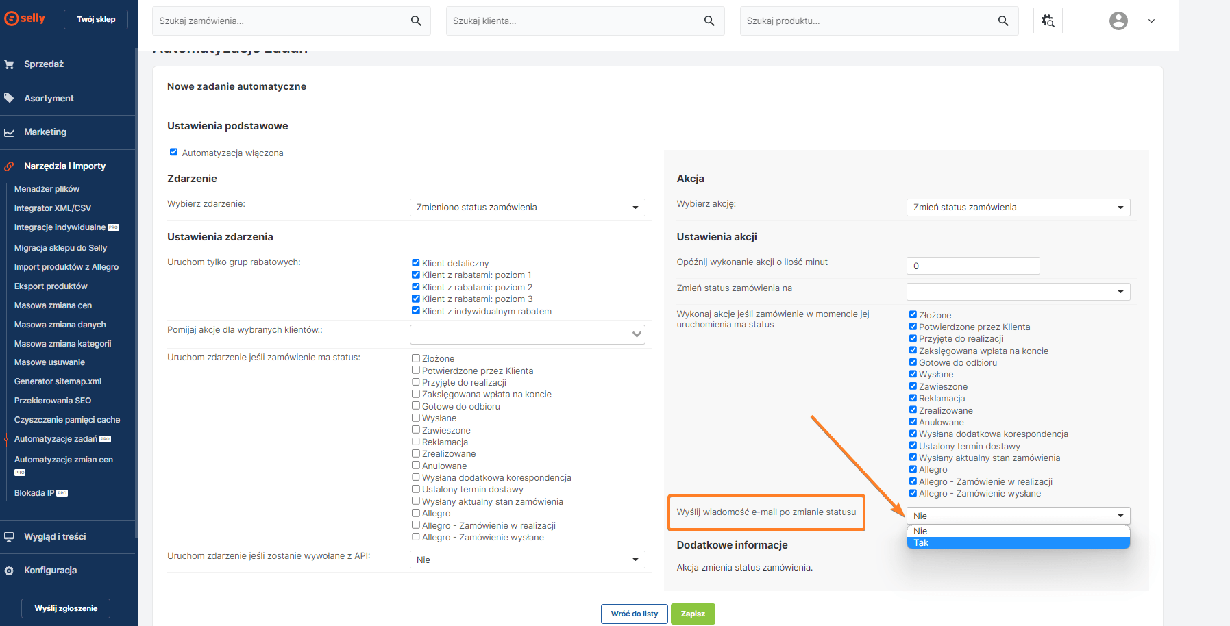 W module Narzędzia i importy/Automatyzacje zadań dodaliśmy nową opcję dla zdarzenia „Zmieniono status zamówienia”. Umożliwia ona wysłanie wiadomości e-mail z szablony przydzielonego dla konkretnego statusu, który zostanie zmieniony przez automatyczne zadanie.