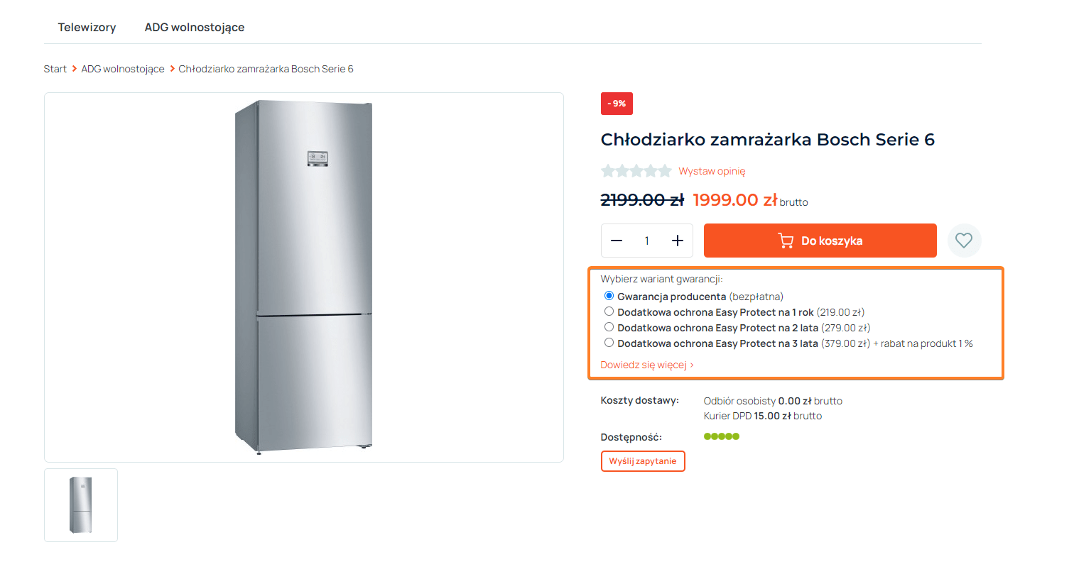 Na karcie produktu pojawi się box z wariantami gwarancji, wybrany tutaj wariant gwarancji przeniesie się do koszyka.