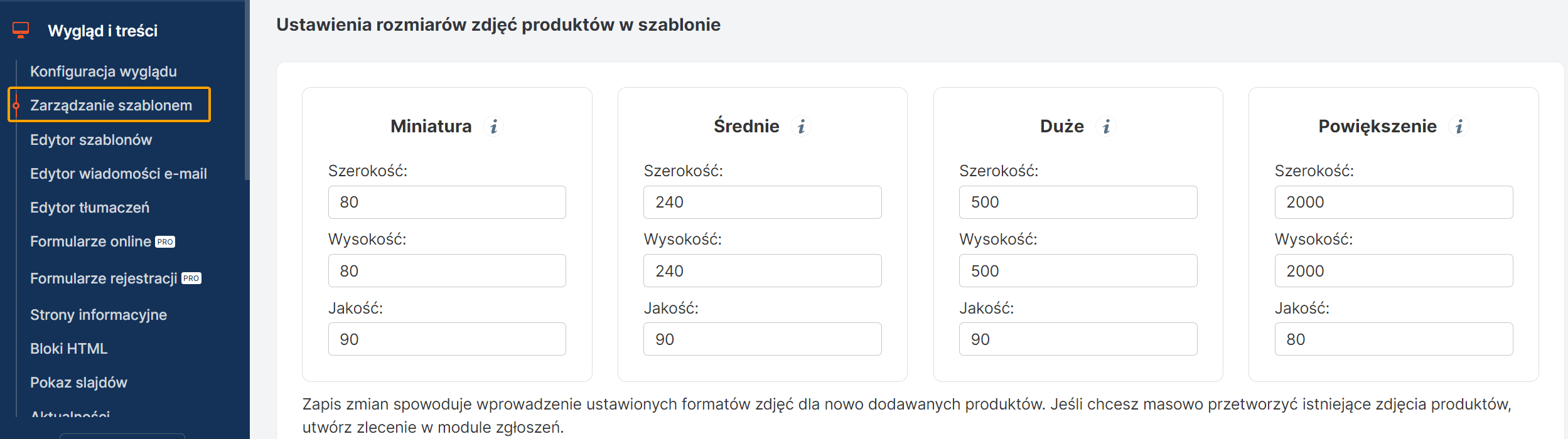 W zakładce Wygląd i treści / Zarządzanie szablonem dodaliśmy moduł pozwalający zarządzeniem rozmiarami zdjęć w szablonie. Od teraz można dostosować rozmiar dla każdego typu zdjęc jak również zmieniać ich jakość. Zmiany dotyczyć będą nowo dodanych produktów.