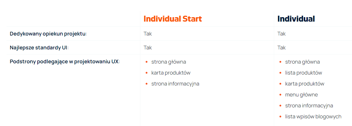 • Individual Start (12 999 zł): Obejmuje projekt strony głównej, karty produktów i strony informacyjnej. Oferuje nieograniczone poprawki w ramach jednej tury oraz responsywne wdrożenie na mobile. Czas realizacji: 3 tygodnie.