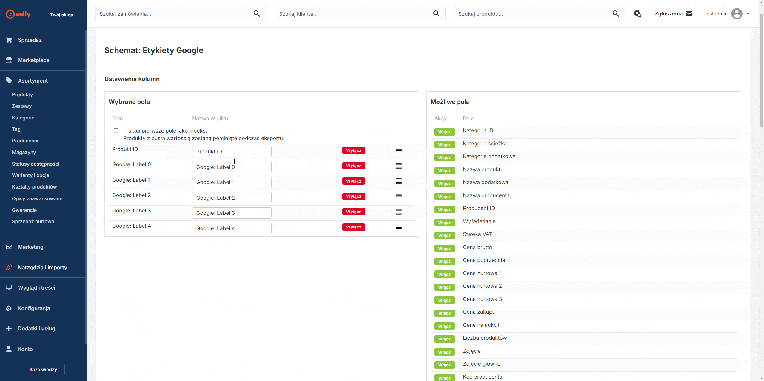 Dodaliśmy nowe pola Etykieta Google w eksporcie CSV oraz integratorze dla Google Zakupów. Umożliwiają one przypisanie do produktów etykiet, które mogą być używane w kampaniach Google Shopping, pozwalając na lepszą klasyfikację produktów. Dostępnych jest pięć pól na etykiety, oznaczonych jako Etykieta 0, Etykieta 1, Etykieta 2, Etykieta 3 i Etykieta 4.
