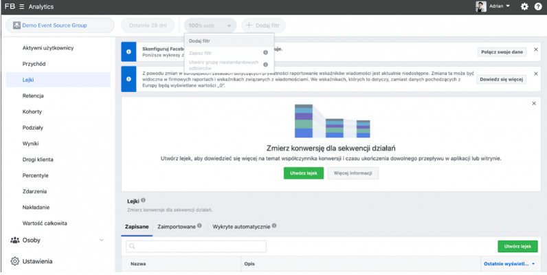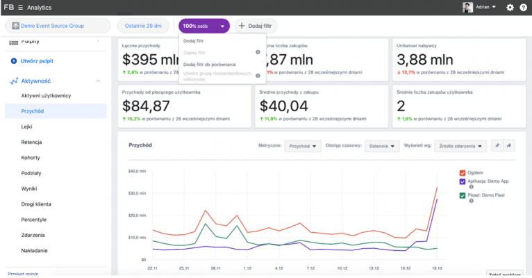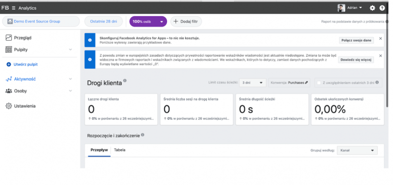 Wersja demonstracyjna Fb Analitycs (https://analytics.facebook.com/) umożliwi Ci zapoznanie się ze wszystkimi elementami panelu i przyswojenie ich sobie bez obaw, że coś skonfigurujesz niepoprawnie. Tutaj możesz patrzeć i eksperymentować.