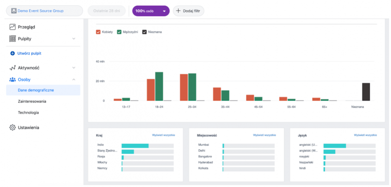 Facebook Analytics bardzo dokładnie pokaże Ci, kto reaguje na Twoje reklamy, w jakim jest wieku, a także jakie są najczęstsze zainteresowania w tej grupie osób. Zobaczysz wszystkie informacje w raporcie “osoby” w panelu.