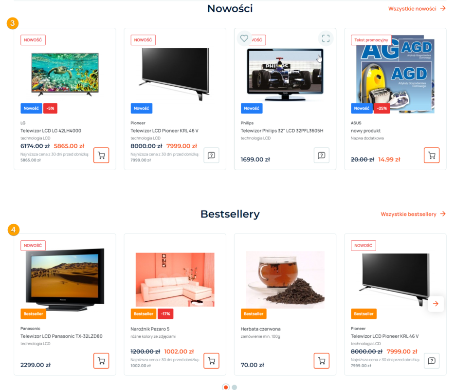 - NOWOŚCI: produkty ostatnio dodane, ilość definiowana w menu Wygląd i treści>Konfiguracja wyglądu – pole: „Ilość nowości wyświetlanych w bloku”.