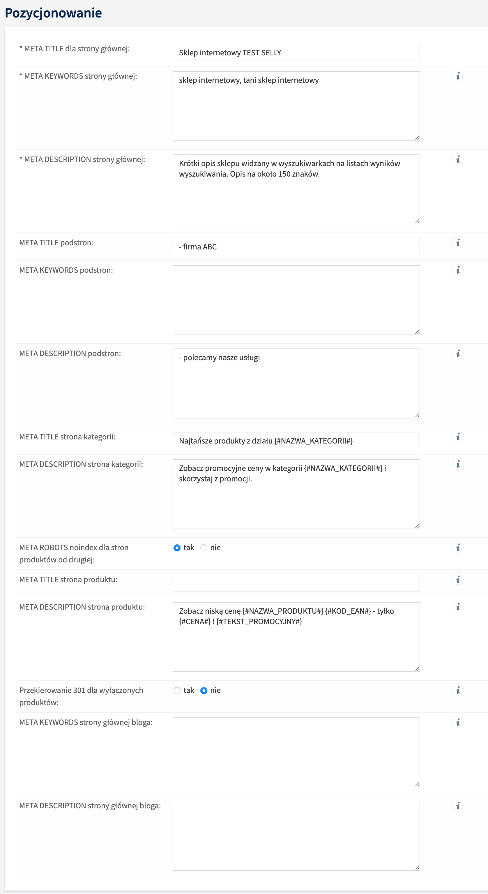 - META DESCRIPTION strona produktu: tekst dołączany do znacznika meta DESCRIPTION strony produktu po polu description wpisanym w edycji danego produktu. Można stosować następujące znaczniki: {#NAZWA_KATEGORII#}, {#NAZWA_PRODUKTU#}, {#CENA#}, {#DOSTEPNOSC#}, {#OPIS_SKROCONY#}, {#TEKST_PROMOCYJNY#}, {#KOSZT_DOSTAWY#} (najniższy niezerowy koszt dostawy danego przedmiotu), {#PRODUCENT#}, {#CHARAKTERYSTYKA#}, {#KOD_EAN#}, {#KOD_PRODUCENTA#} gdzie:<br />