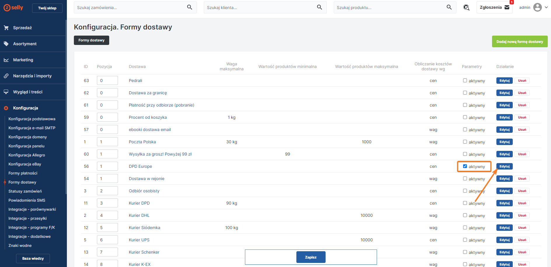 - Wyświetli się lista form dostaw – przejdź do edycji każdej z aktywnych form dostaw i aktywuj dostępność CA Rat zaznaczając checkbox „aktywny”