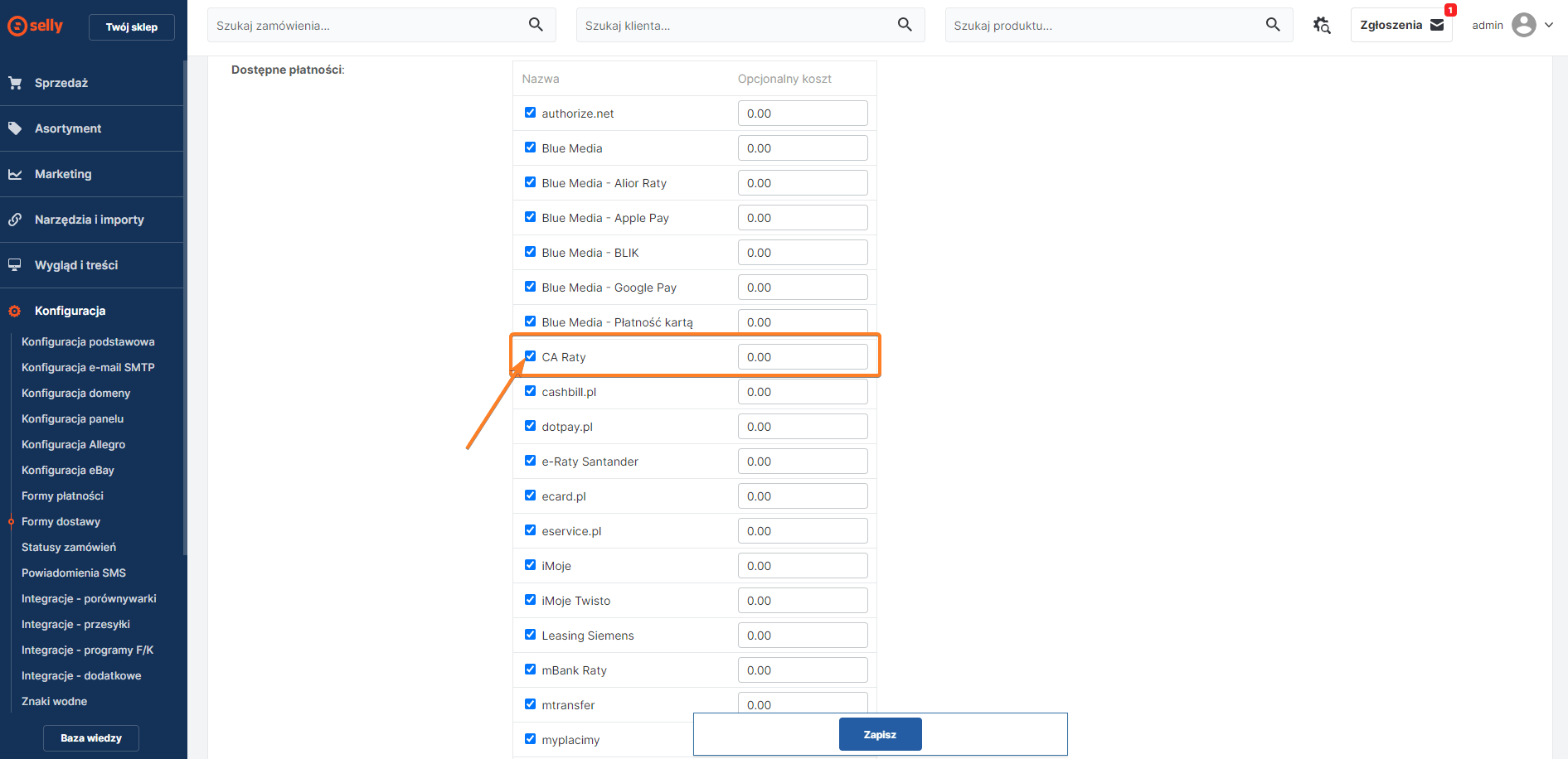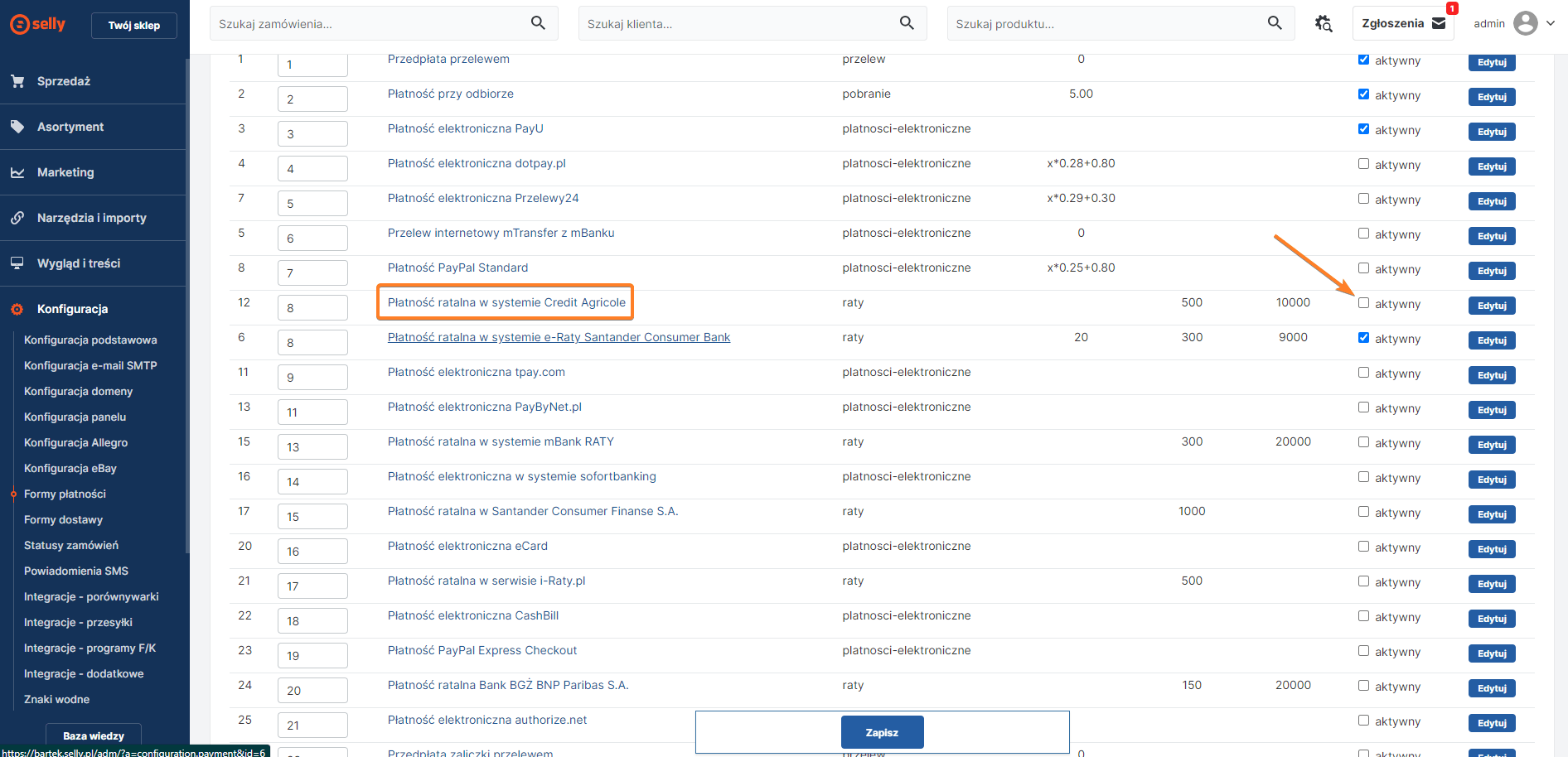 - Aktywuj formę o nazwie „Płatność ratalna w systemie Credit Agricole” (ID płatności nr 12)