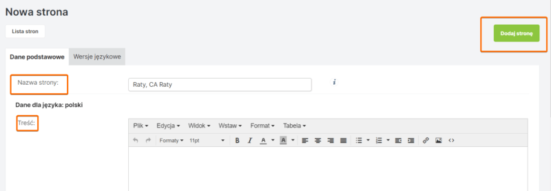 - Następnie kliknij: Dodaj stronę, uzupełnij jej nazwę i tytuł, np. Raty, CA Raty: