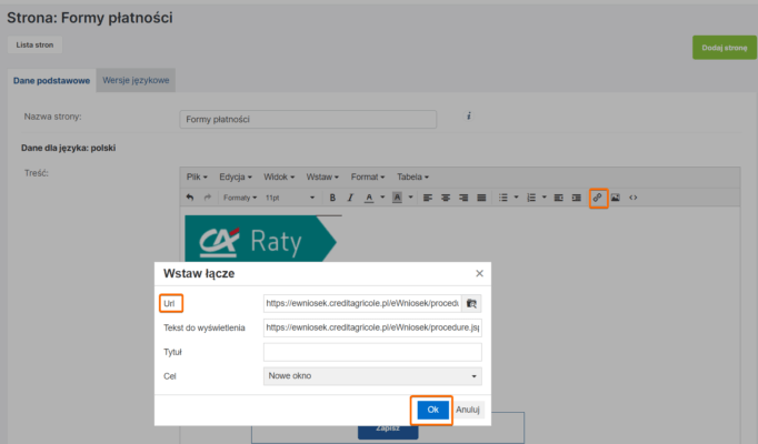 - Logotyp można podlinkować procedurą ratalną, klikając na niego i wybierając z górnego menu