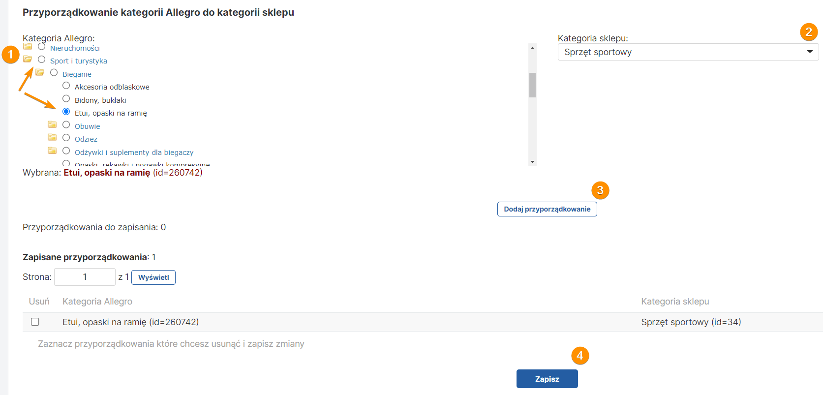 UWAGA: Mapowanie w systemie dotyczy wyłącznie importowanych aukcji – czyli produktów pobieranych z Allegro do sklepu. W przypadku, gdy chcemy wystawiać produkty ze sklepu na Allegro, konieczne jest wykonanie osobnego mapowania kategorii w konfiguracji.