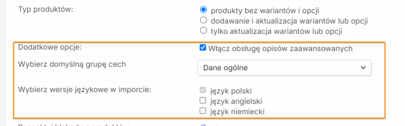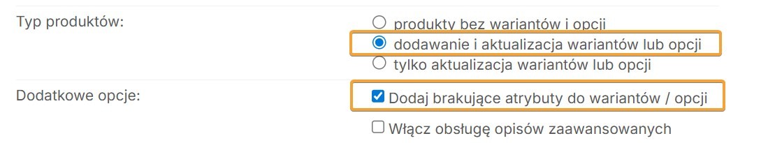 • Tylko dodawanie produktów + produkty bez wariantów: dodaje produkt jeśli nie istnieje, jeśli produkt istnieje pomija dodawanie.