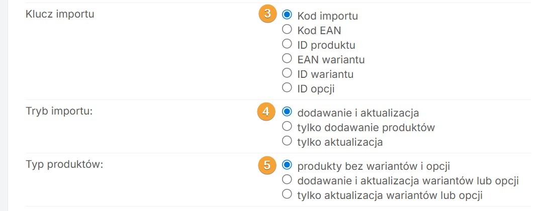 kroku 3 wybierz klucz importu jako kod importu lub kod EAN, który posłuży do parowania produktów znajdujących się w pliku importu z produktami w bazie sklepu. Według tego klucza będą też aktualizowane produkty w sklepie.