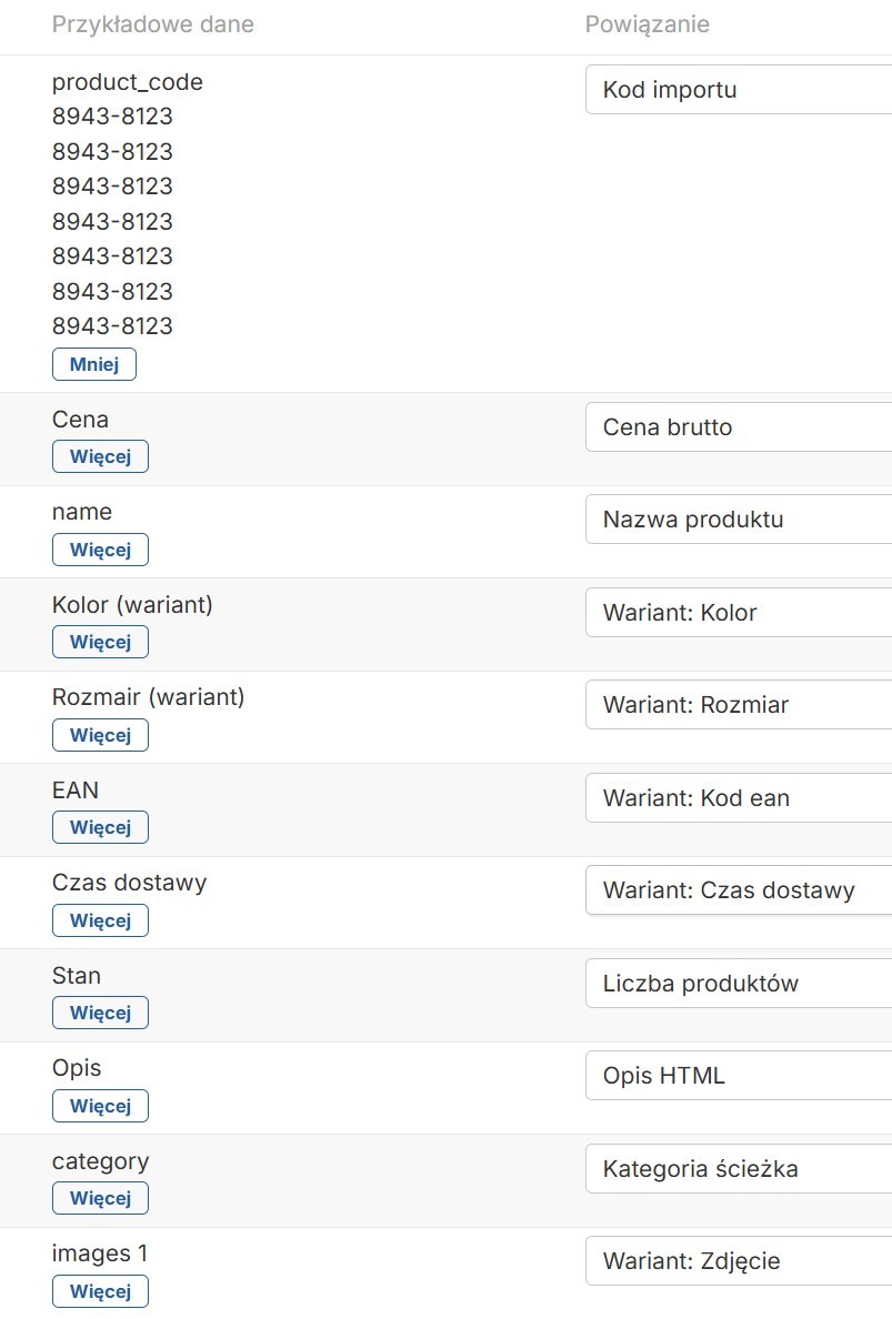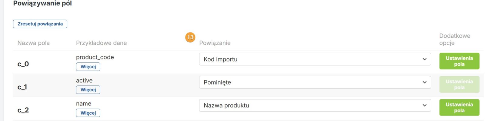 W sekcji Powiązywanie pól (krok 13) parujemy kolumnę Przykładowe dane (dane z pliku) z kolumną Powiązanie (pola w bazie sklepu).