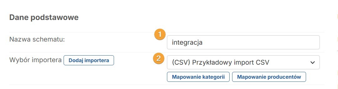 W kroku 1 wpisz własną nazwę schematu, w kroku 2 wybierz przypisanie produktów do odpowiedniego importera. Możesz dodawać importerów aby stworzyć niezależne integracje z różnymi dostawcami.