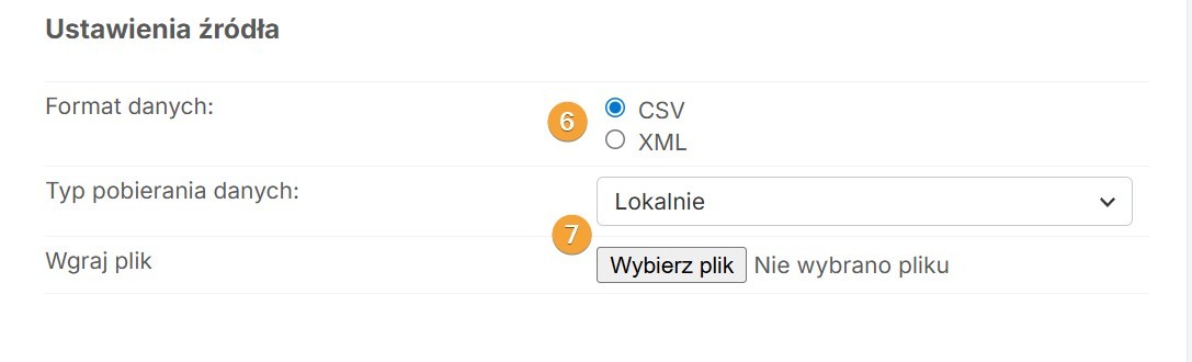W 6 kroku wybierz format danych pliku: CSV (struktura dowolna, kodowanie UTF-8) lub XML.