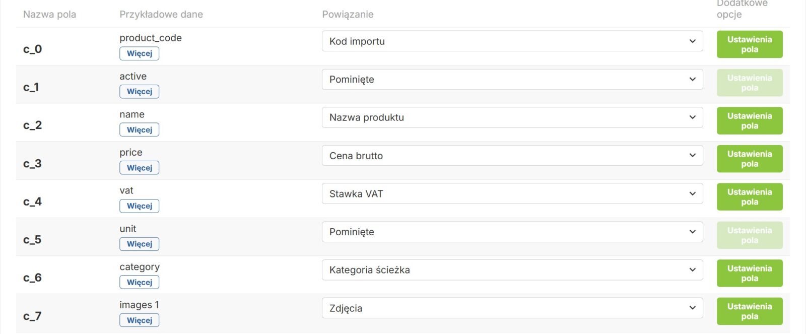 Ustawienia dodatkowe pól pozwalają dostosować dane importowane z pliku. W zależności od typu pola można zastosować różne reguły, przekształcenia lub mapowania. Poniżej przedstawiamy przykładowe zastosowania:
