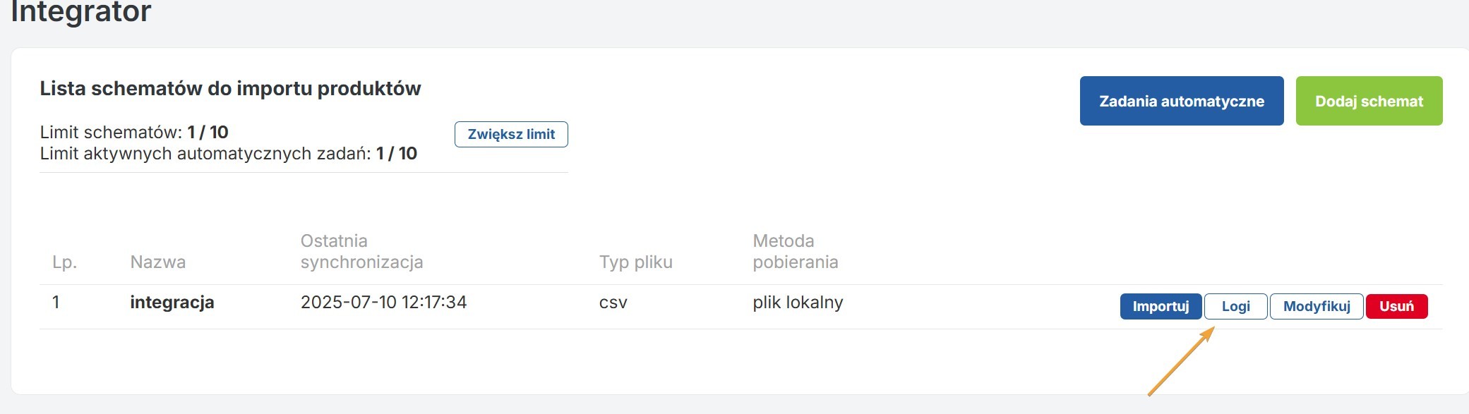 W Z poziomu listy schematów możesz sprawdzić logi importu, aby zweryfikować przebieg procesu i ewentualne błędy.