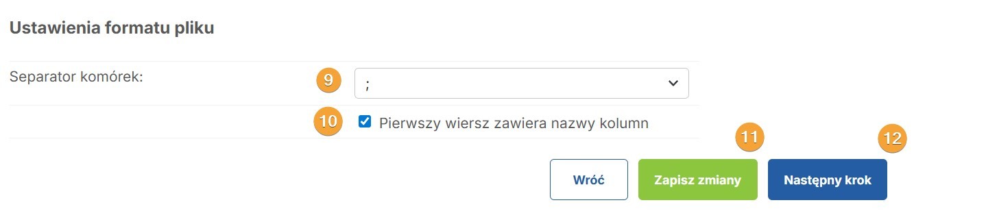 Jeśli plik CSV wybierz odpowiedni separator komórek. Zaznacz checkbox „Pierwszy wiersz zawiera nazwy kolumn” (krok 10)  jeśli dotyczy.