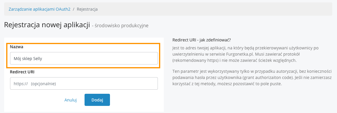 - Na stronie API Furgonetki: https://furgonetka.pl/api/aplikacje-oauth/dodaj zarejestruj nową aplikację: