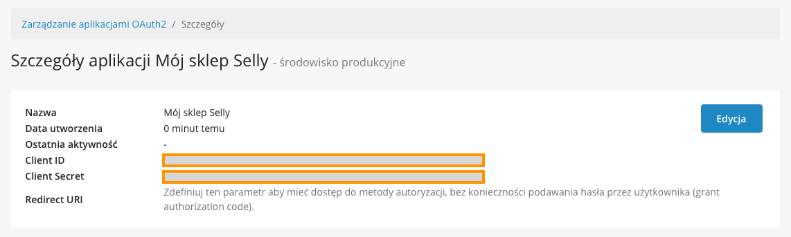 – na kolejnej stronie otrzymasz wygenerowane klucze Client ID oraz Client Secret.