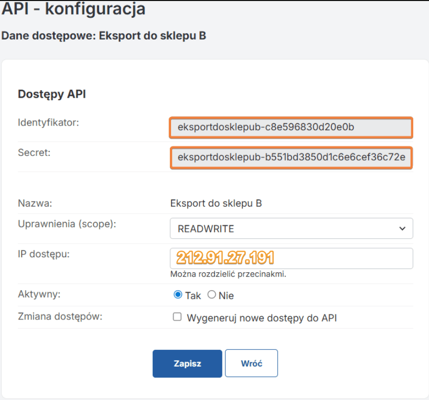 • Identyfikator: kopiujemy wartość identyfikatora ze sklepu A.
