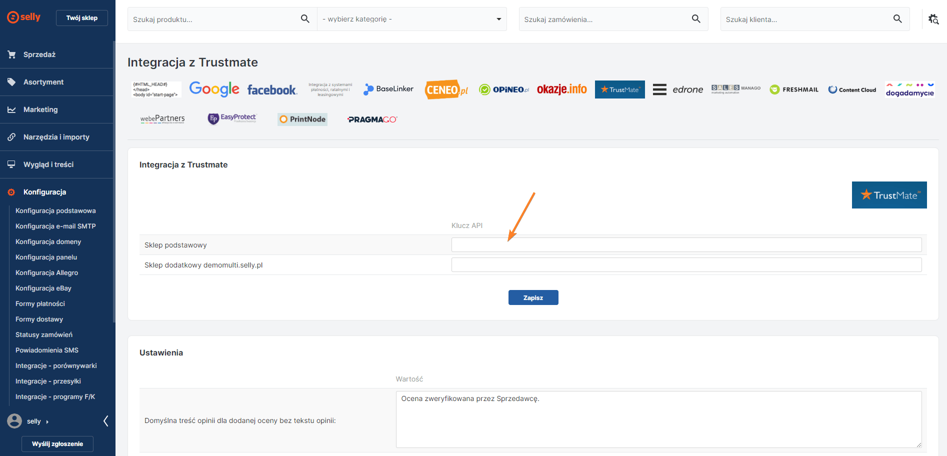 Następnie przejdź, a dokładnie do modułu Konfiguracja/Integracje-dodatkowe, kliknij logo TrustMate i w polu „Klucz API” wklej wcześniej skopiowany klucz. Zapisz.