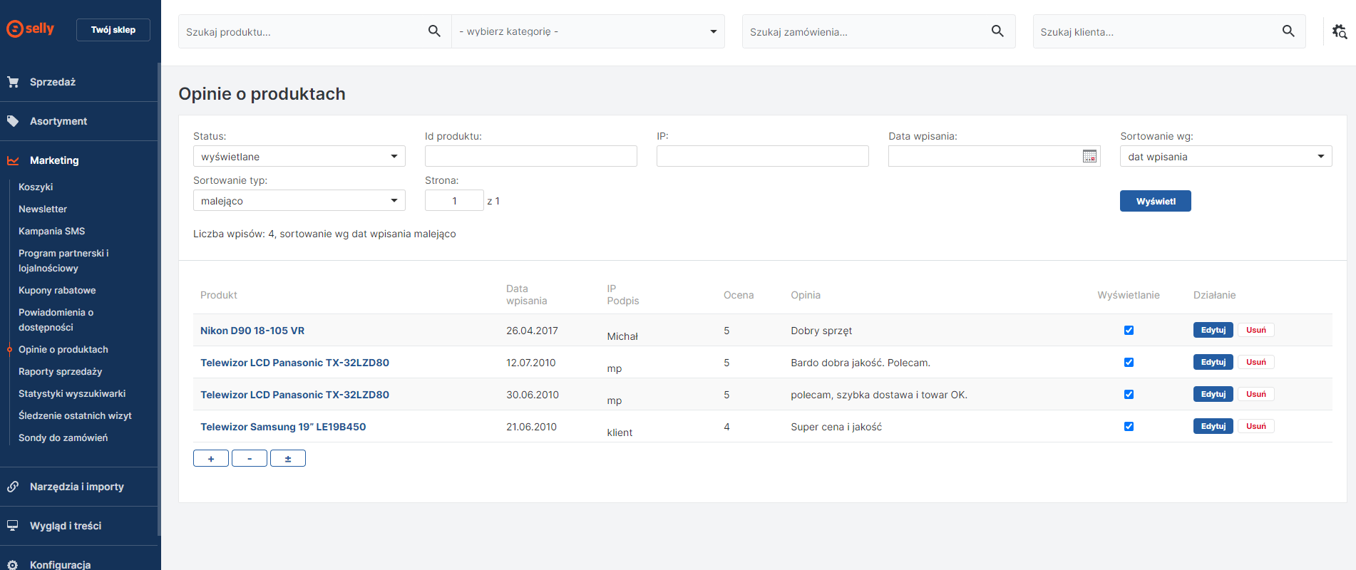 - Przed północą wszystkie opinie są importowane do panelu sklepu – Marketing -> Opinie i zostaną wyświetlone przy produkcie.
