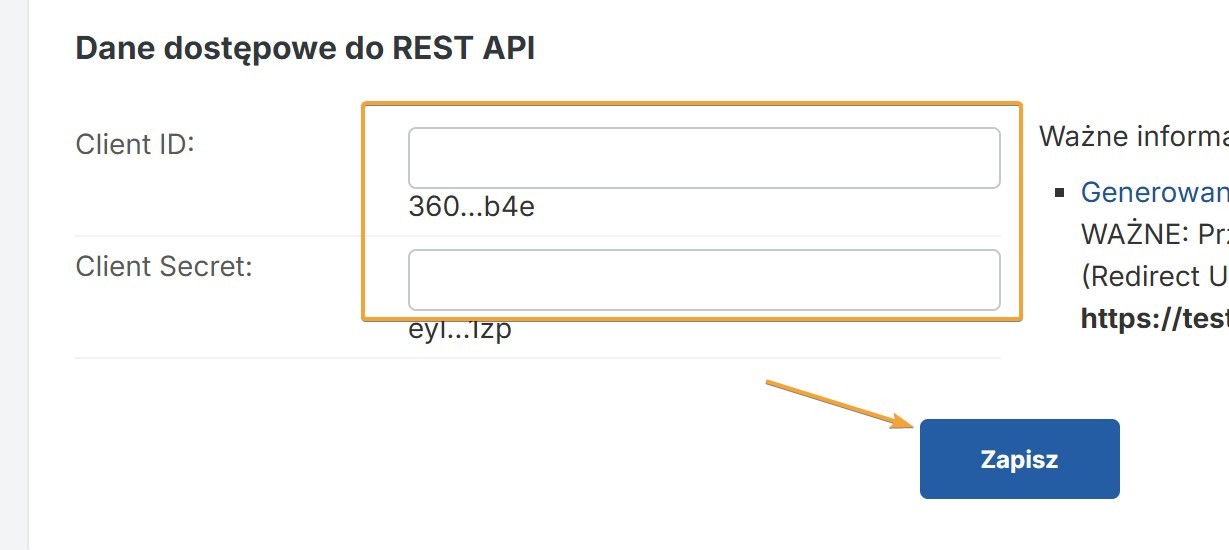 W panelu sklepu w menu Konfiguracja → konfiguracja Allegro → Dane ogólne: w polu Client ID oraz Client Secret wklej skopiowane wartości.