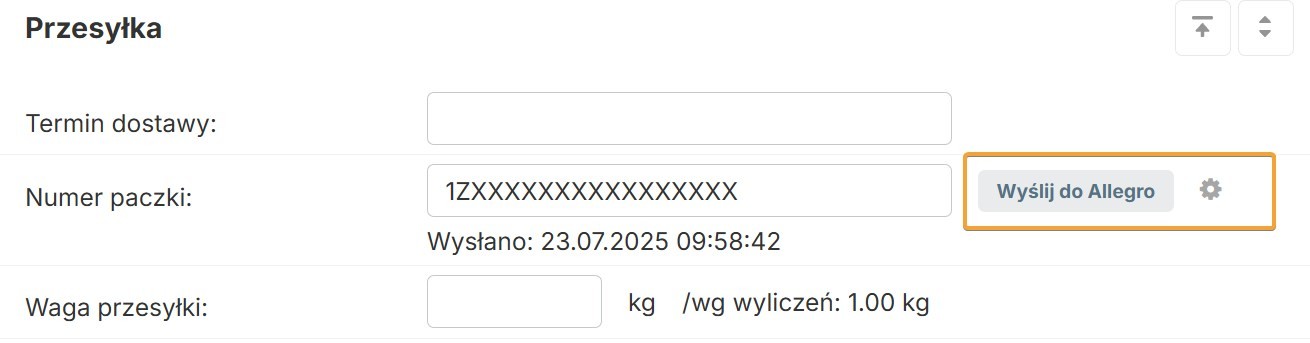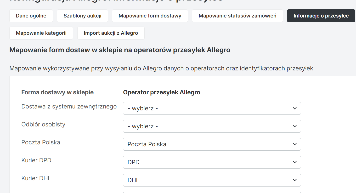 Mapowanie wykorzystywane przy wysyłaniu do Allegro danych o operatorach oraz identyfikatorach przesyłek. W chwili utworzenia przesyłki z poziomu edycji zamówienia, numer zostanie automatycznie przekazany do Allegro. Jeśli numer paczki się zmienił można skorzystać z przycisku „Wyślij do Allegro”