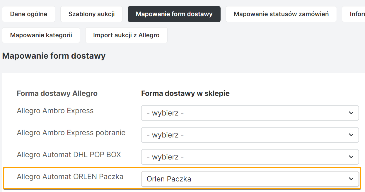 Wybrane formy dostaw w Allegro zostaną w pobranych zamówieniach przypisane do form dostaw sklepu. Jeśli nie używasz np. Ambro Express, nie musisz mapować tej formy. Przyporządkuj formę dostawy i zapisz.