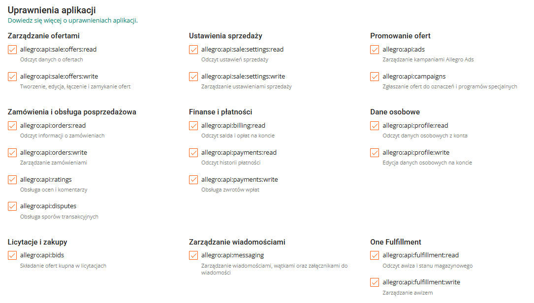 W sekcji Uprawnienia aplikacji zaznacz wszystkie zgody dla połączenia API.