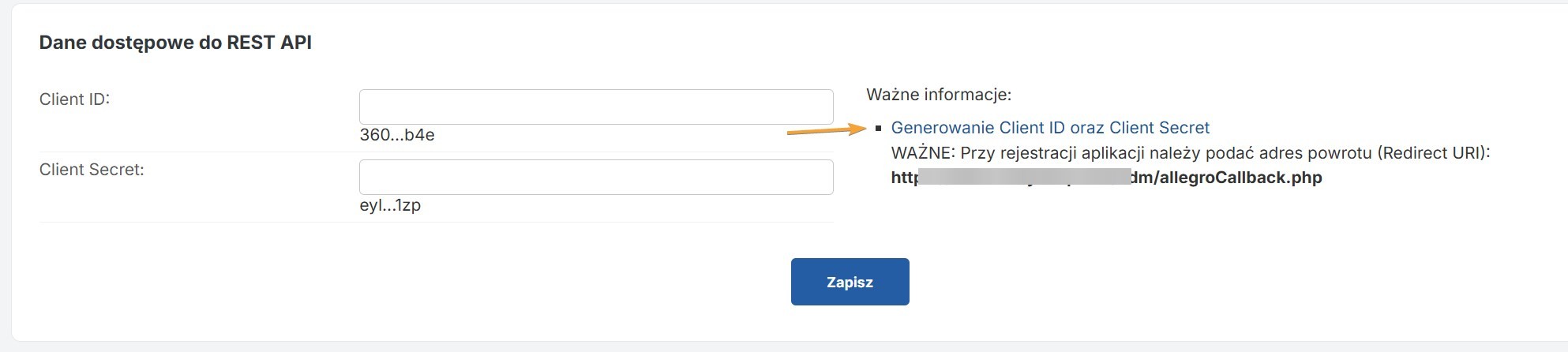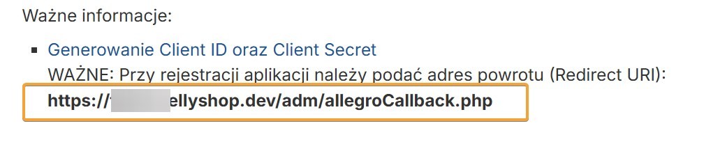 W sekcji „Dane dostępowe do REST API” znajdziesz adres Twojej domeny, np. https://***/allegroCallback.php – skopiowany adres wklejamy do pola „Adres URI do przekierowania”.
