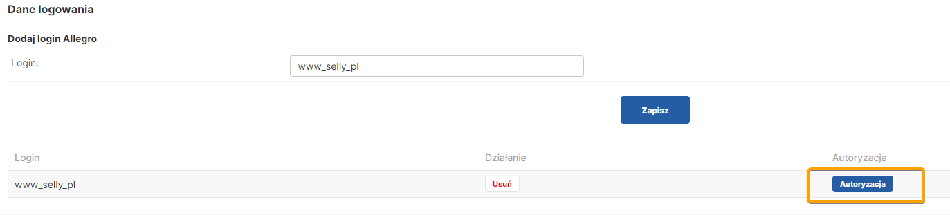4. Przeprowadź autoryzację konta. W sekcji „Dane logowania” wpisz login Allegro i zapisz. Następnie kliknij przycisk „Autoryzacja”.