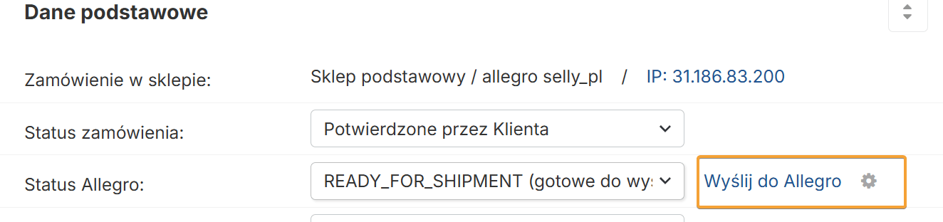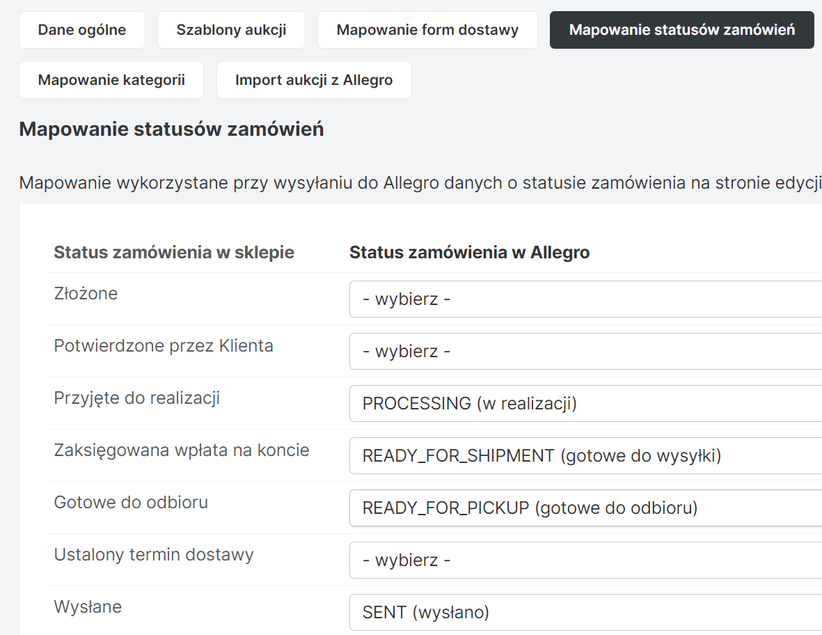 Mapowanie wykorzystywane przy wysyłaniu do Allegro danych o statusie zamówienia. . Status zamówienia może zostać przekazany do Allegro automatycznie w momencie zapisu zamówienia lub ręcznie, po kliknięciu przycisku „Wyślij do Allegro”
