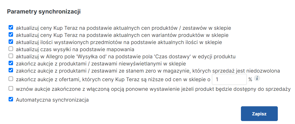 - Zaznacz: „Uaktualnij dane w Allegro (bez nazwy własnej) na podstawie danych z bazy sklepu”.