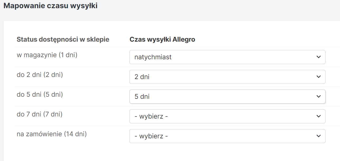 Mapowanie wykorzystywane podczas wystawiania nowych aukcji na Allegro. Aktualizacja czasu wysyłki dostępna od planów Pro (programowane na zlecenie).