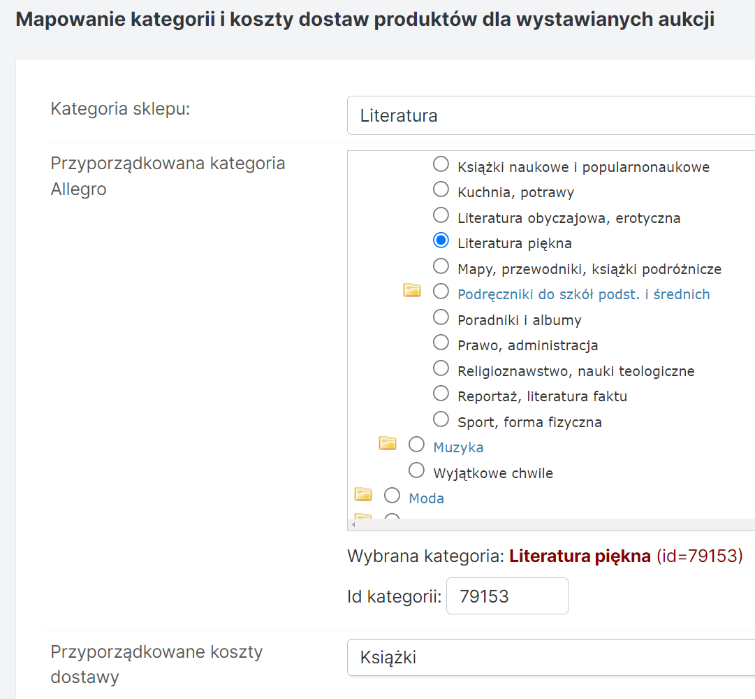 W tej zakładce zmapuj kategorie sklepu do najgłębszego poziomu kategorii w Allegro. Możesz też przypisać koszty dostaw dla danej kategorii. Kategorie sklepowe przypisz do ostatniego poziomu (czarne), niebieskie to kategorie główne, których nie można mapować.