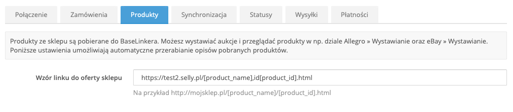7. W zakładce PRODUKTY zdefiniuj wzór linku do produktu, wg szablonu: https://adres-sklepu.pl/[product_name],id[product_id].html