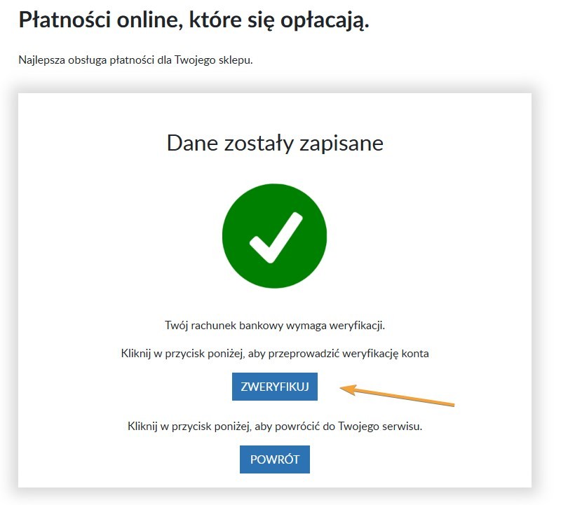 Przejdź do weryfikacji rachunku, kliknij przycisk ZWERYFIKUJ, aby przeprowadzić przelew weryfikacyjny z konta firmowego na numer wskazany przez Autopay.