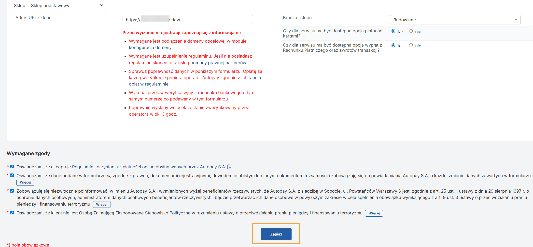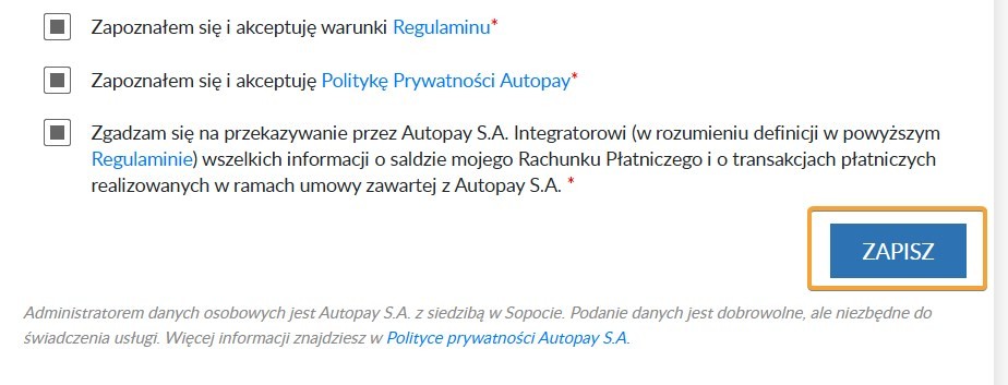 Wypełnij formularz wstępny w panelu oraz kliknij Zapisz, a następnie zostaniesz automatycznie przekierowany na formularz rejestracyjny Autopay.
