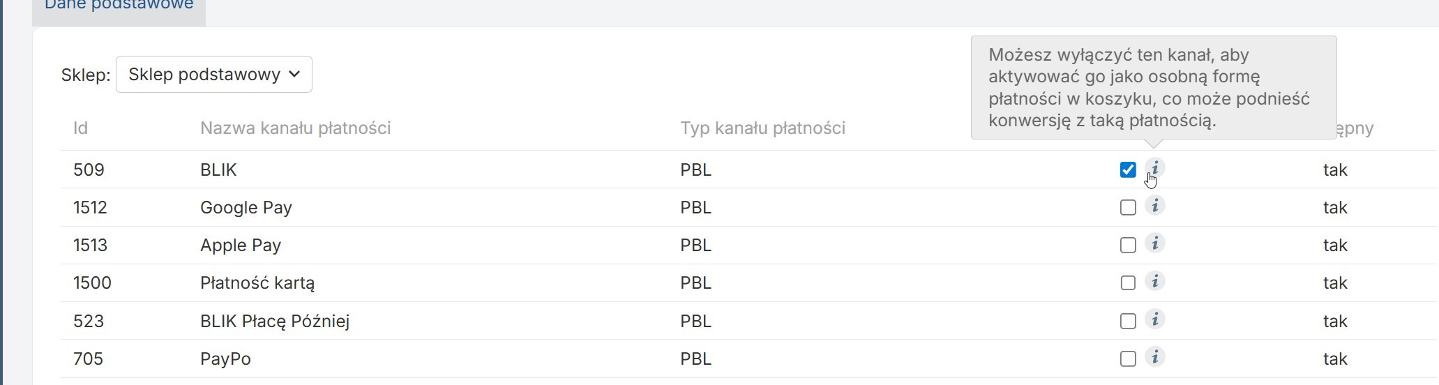 Możesz dezaktywować dowolny kanał, jeśli chcesz, by wyświetlał się osobno w koszyku jako osobna metoda płatności.
